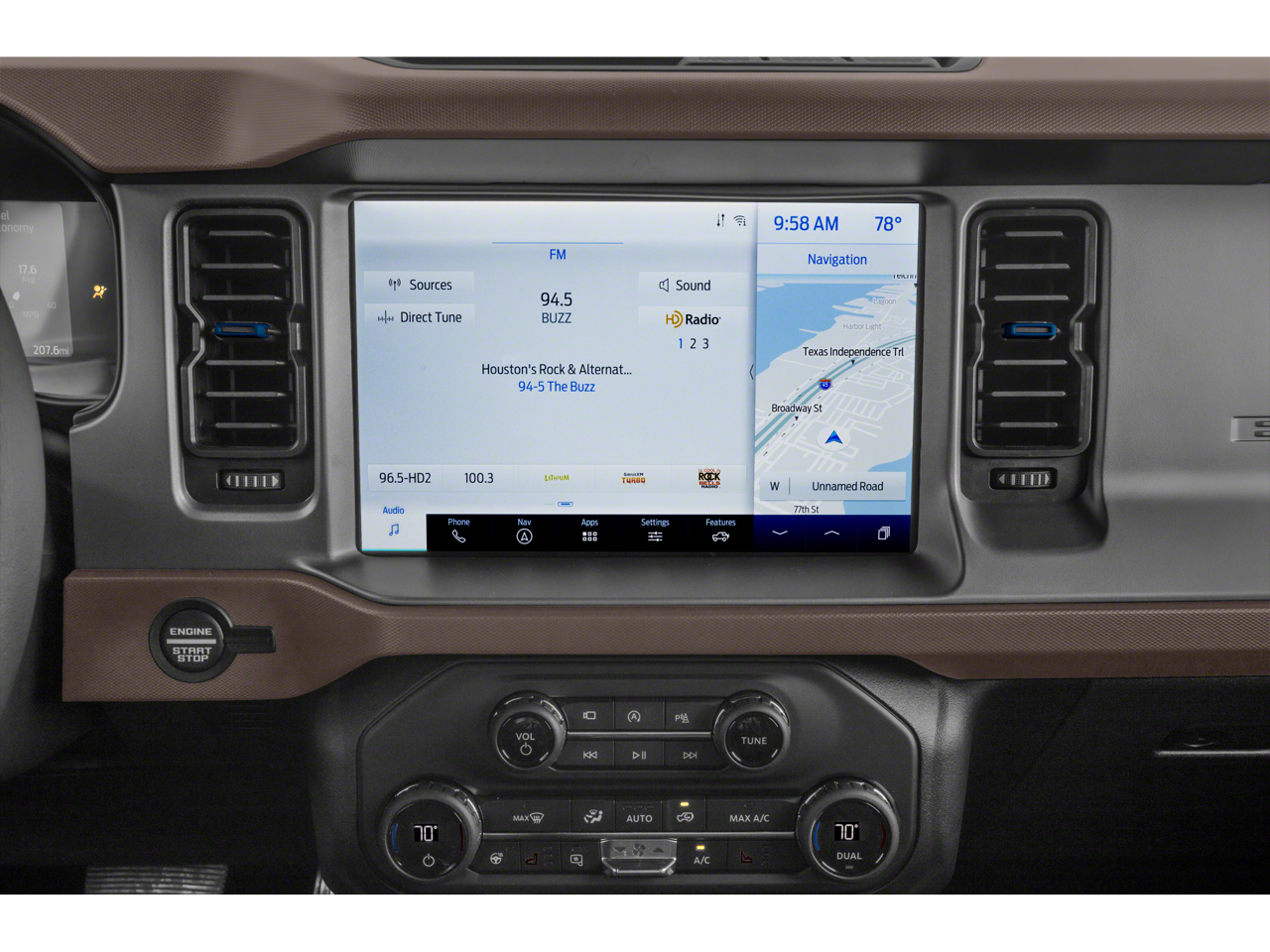 Check out all these great options Equipment Group 313A High Package (12 LCD Capacitive Touchscreen w/Swipe Capability, 360-Degree Camera, Additional Sound Deadening, Front Parking Sensors, Information on Demand Panel, and Sideview Mirrors), 18 Bright Machined Aluminum Wheels, 4-Wheel Disc Brakes, 4.27 Axle Ratio, 6 Speakers, ABS brakes, Air Conditioning, Alloy wheels, AM/FM radio: SiriusXM with 360L, AM/FM Stereo, Auto High-beam Headlights, Auto-dimming Rear-View mirror, Automatic temperature control, Auxiliary Switches, Brake assist, Compass, Connected Navigation, Delay-off headlights, Driver door bin, Driver vanity mirror, Dual front impact airbags, Dual front side impact airbags, Electronic Stability Control, Emergency communication system: 911 Assist, Exterior Parking Camera Rear, Ford Performance Heavy-Duty Modular Front Bumper, Front anti-roll bar, Front Bucket Seats, Front Center Armrest, Front dual zone A/C, Front fog lights, Front reading lights, Front wheel independent suspension, Fully automatic headlights, Heated Cloth Bucket Seats, Heated door mirrors, Heated front seats, Illuminated entry, Integrated roll-over protection, Keyless Entry Keypad, Leather Shift Knob, Low tire pressure warning, Navigation system: Connected Navigation, Occupant sensing airbag, Outside temperature display, Overhead airbag, Overhead console, Panic alarm, Passenger door bin, Passenger vanity mirror, Power door mirrors, Power steering, Power windows, Radio data system, Remote keyless entry, Security system, SiriusXM Radio w/360L, Slide-Out Tailgate, Speed control, Split folding rear seat, Steering wheel mounted audio controls, SYNC 4, Tachometer, Telescoping steering wheel, Tilt steering wheel, Traction control, Trip computer, Variably intermittent wipers, and Voltmeter. Area 51 2022 Ford Bronco Outer Banks 4WD 10-Speed Automatic 2.3L EcoBoost I-4